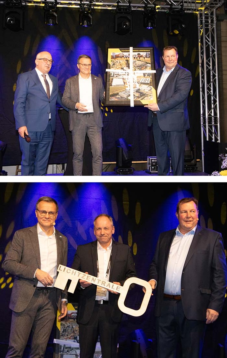 Zum Abschluss trat Uwe Schaffitzel Geschäftsbereichsleiter vom Würth Elektrogroßhandel auf die Bühne und gab einen Rückblick auf die Entstehung von Würth und gratulierte der LICHTZENTRALE zu Ihrem neuen Logistikgebäude. Anschließend überreichte er symbolisch einen großen Holzschlüssel an Damjan Plahuta und Kai Spahn, der von ihnen direkt an den Logistikleiter Jens Berger übergeben wurde. Ebenso mit dabei waren an diesem Tag Lieferanten, Nachbarn der LICHTZENTRALE Reinsdorf sowie Führungskräfte weiterer Würth Elektrogroßhandel Gesellschaften.